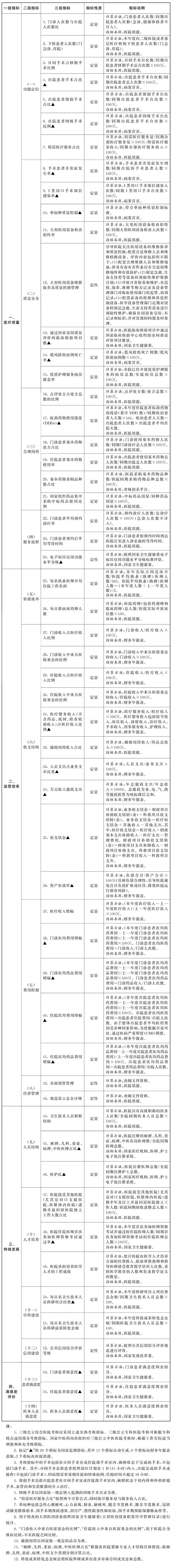 附原文: 国务院办公厅关于加强三级公立医院绩效考核工作的意见 各省、自治区、直辖市人民政府,国务院各部委、各直属机构: 为进一步深化公立医院改革,推进现代医院管理制度建设,经国务院同意,现就加强三级公立医院绩效考核工作提出以下意见。 一、总体要求 (一)指导思想。 以习近平新时代中国特色社会主义思想为指导,全面贯彻党的十九大和十九届二中、三中全会精神,实施健康中国战略,建立健全基本医疗卫生制度,加强和完善公立医院管理,坚持公益性,调动积极性,引导三级公立医院进一步落实功能定位,提高医疗服务质量和效率,推进分级诊疗制度建设,为人民群众提供高质量的医疗服务。 (二)基本原则。 坚持公益性导向,提高医疗服务效率。以满足人民群众健康需求为出发点和立足点,服务深化医药卫生体制改革全局。改革完善公立医院运行机制和医务人员激励机制,实现社会效益和经济效益、当前业绩和长久运营、保持平稳和持续创新相结合。强化绩效考核导向,推动医院落实公益性,实现预算与绩效管理一体化,提高医疗服务能力和运行效率。 坚持属地化管理,做好国家顶层设计。国家制定统一标准、关键指标、体系架构和实现路径,以点带面,抓住重点,逐级考核,形成医院管理提升的动力机制。各省份按照属地化管理原则,结合经济社会发展水平,对不同类别医疗机构设置不同指标和权重,提升考核的针对性和精准度。 坚持信息化支撑,确保结果真实客观。通过加强信息系统建设,提高绩效考核数据信息的准确性,保证关键数据信息自动生成、不可更改,确保绩效考核结果真实客观。根据医学规律和行业特点,发挥大数据优势,强化考核数据分析应用,提升医院科学管理水平。 (三)工作目标。 通过绩效考核,推动三级公立医院在发展方式上由规模扩张型转向质量效益型,在管理模式上由粗放的行政化管理转向全方位的绩效管理,促进收入分配更科学、更公平,实现效率提高和质量提升,促进公立医院综合改革政策落地见效。2019年,在全国启动三级公立医院绩效考核工作,绩效考核指标体系、标准化支撑体系、国家级和省级绩效考核信息系统初步建立,探索建立绩效考核结果运用机制。到2020年,基本建立较为完善的三级公立医院绩效考核体系,三级公立医院功能定位进一步落实,内部管理更加规范,医疗服务整体效率有效提升,分级诊疗制度更加完善。 二、指标体系 三级公立医院绩效考核指标体系由医疗质量、运营效率、持续发展、满意度评价等4个方面的指标构成。国家制定《三级公立医院绩效考核指标》(见附件)供各地使用,同时确定部分指标作为国家监测指标。各地可以结合实际,适当补充承担政府指令性任务等部分绩效考核指标。 (一)医疗质量。提供高质量的医疗服务是三级公立医院的核心任务。通过医疗质量控制、合理用药、检查检验同质化等指标,考核医院医疗质量和医疗安全。通过代表性的单病种质量控制指标,考核医院重点病种、关键技术的医疗质量和医疗安全情况。通过预约诊疗、门急诊服务、患者等待时间等指标,考核医院改善医疗服务效果。 (二)运营效率。运营效率体现医院的精细化管理水平,是实现医院科学管理的关键。通过人力资源配比和人员负荷指标考核医疗资源利用效率。通过经济管理指标考核医院经济运行管理情况。通过考核收支结构指标间接反映政府落实办医责任情况和医院医疗收入结构合理性,推动实现收支平衡、略有结余,有效体现医务人员技术劳务价值的目标。通过考核门诊和住院患者次均费用变化,衡量医院主动控制费用不合理增长情况。 (三)持续发展。人才队伍建设与教学科研能力体现医院的持续发展能力,是反映三级公立医院创新发展和持续健康运行的重要指标。主要通过人才结构指标考核医务人员稳定性,通过科研成果临床转化指标考核医院创新支撑能力,通过技术应用指标考核医院引领发展和持续运行情况,通过公共信用综合评价等级指标考核医院信用建设。 (四)满意度评价。医院满意度由患者满意度和医务人员满意度两部分组成。患者满意度是三级公立医院社会效益的重要体现,提高医务人员满意度是医院提供高质量医疗服务的重要保障。通过门诊患者、住院患者和医务人员满意度评价,衡量患者获得感及医务人员积极性。 三、支撑体系 (一)提高病案首页质量。三级公立医院要加强以电子病历为核心的医院信息化建设,按照国家统一规定规范填写病案首页,加强临床数据标准化、规范化管理。各地要加强病案首页质量控制和上传病案首页数据质量管理,确保考核数据客观真实。 (二)统一编码和术语集。2019年3月底前,国家卫生健康委推行全国统一的疾病分类编码、手术操作编码和医学名词术语集。国家中医药局印发全国统一的中医病证分类与代码和中医名词术语集。2019年8月底前,各地组织三级公立医院完成电子病历的编码和术语转换工作,全面启用全国统一的疾病分类编码、手术操作编码、医学名词术语。 (三)完善满意度调查平台。国家建立公立医院满意度管理制度,根据满意度调查结果,不断完善公立医院建设、发展和管理工作。2019年3月底前,全国三级公立医院全部纳入国家卫生健康委满意度调查平台。各地要应用国家卫生健康委满意度调查平台,将调查结果